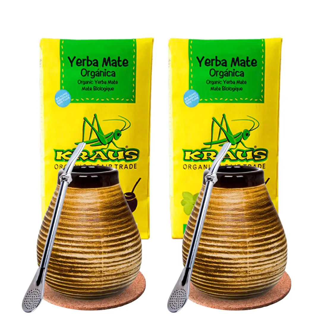 Zestaw do yerba mate dla dwojga Kraus Organica – 2x yerba mate 500 g, 2x ceramiczna brązowa tykwa 350 ml, 2x podkładka korkowa i 2x bombilla Liza. Świetny komplet do wspólnego picia i parzenia ostrokrzew paragwajskiego.